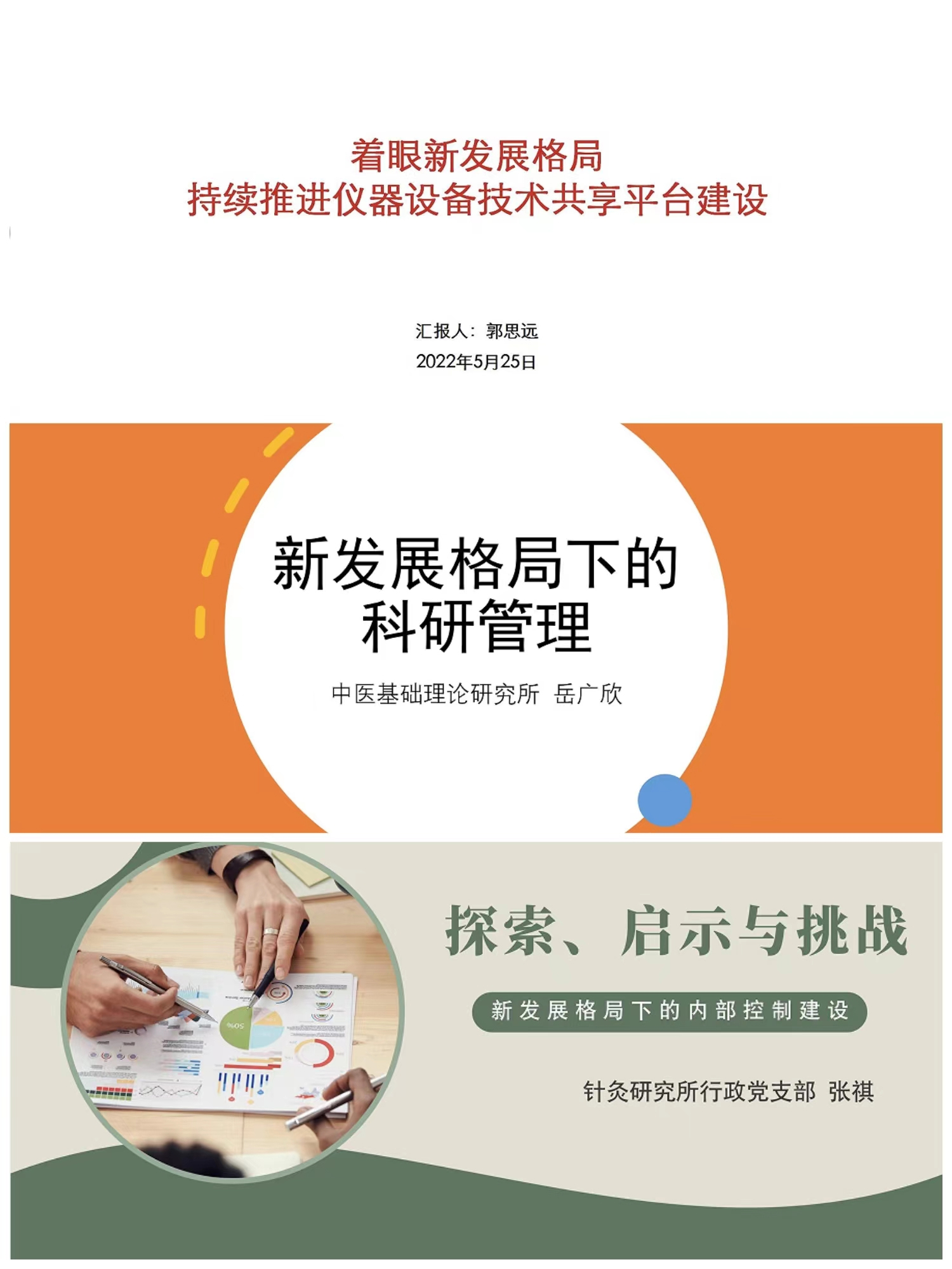 随后,郭思远、岳广欣、张祺分别以《着眼新发展格局,持续推进仪器设备技术共享平台建设》《新发展格局下的科研管理》《探索、启示与挑战——新发展格局下的内部控制建设》为题,结合各自岗位实际,分享了工作中创新管理方法的举措、突出成效和心得体会等。