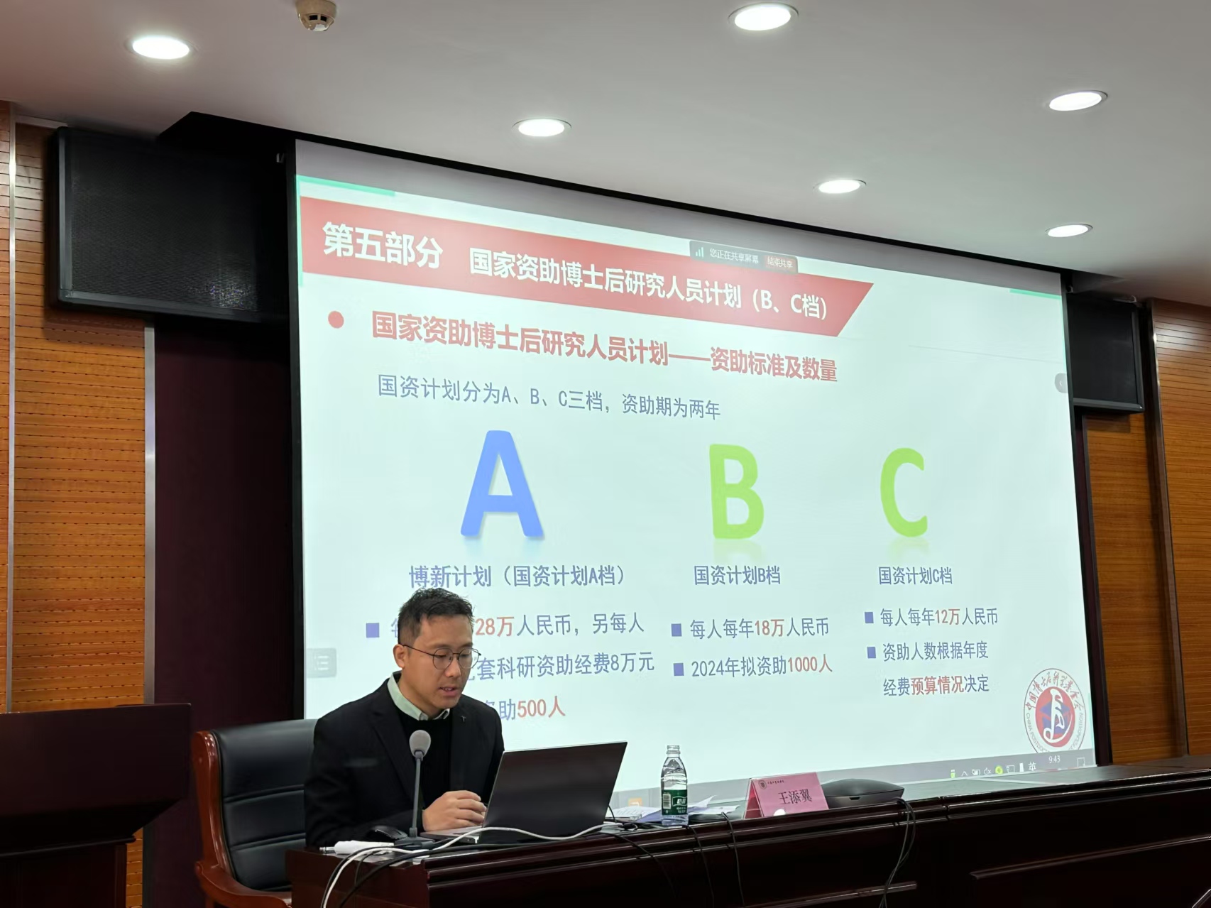 12月6日,中国中医科学院博士后管理办公室组织召开博士后管理人员和新进站博士后人员培训会。会议邀请中国博士后科学基金会博士后评估与服务处王添翼同志进行现场授课。