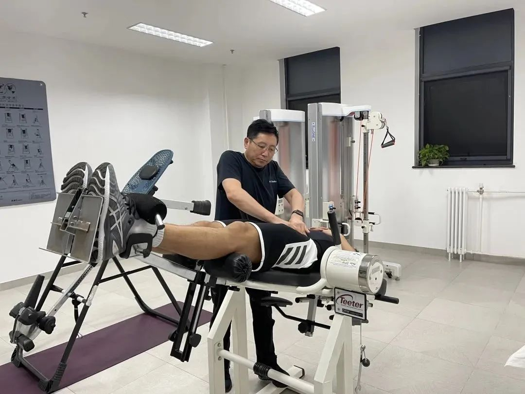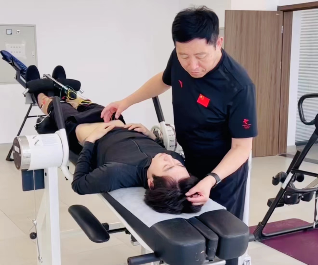 自从七月份,中国中医科学院中医门诊部王守东主任医师把“中医倒挂倒流复位疗法”和设备带进了国家冰雪训练科研基地,受到了很多运动员的喜爱,这一疗法是他与其儿子王焱垚共同研发的。治疗时固定双脚使其身体头低脚高位倾斜或完全倒置悬挂,利用地球引力和自身重量牵引,可以缓解头晕、头痛、失眠等症状、同时缓解心理压力和训练带来的疲劳,有效帮助运动员们恢复体力。
