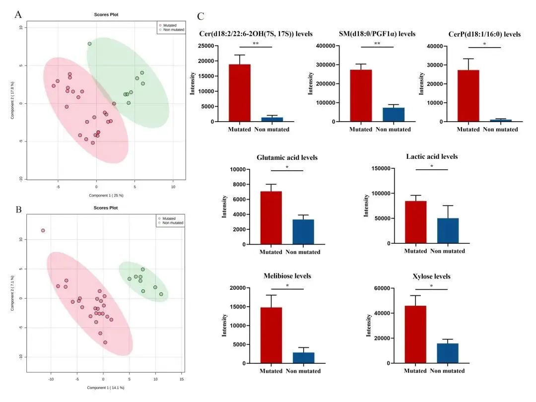 图2:根据JAK2突变状态的PV患者的特异性代谢特征。(A、B) 正、负离子模式下JAK2突变组与JAK2未突变组患者的PLS-DA得分图。(C) 与JAK2未突变的患者相比,JAK2突变患者7种化合物的水平。