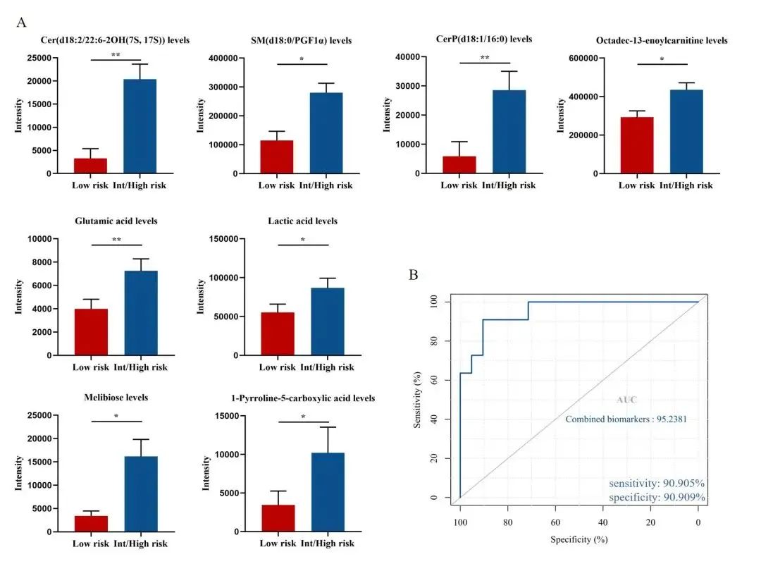 图3:PV患者预后相关潜在生物标志物。(A) 与低危患者相比,中高危患者8种内源性标志物的水平。(B) 4种生物标志物组合的ROC曲线分析。