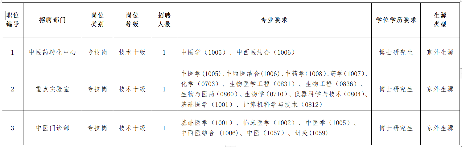 注:1.岗位3为中医基础理论研究所事业编制岗位,人事关系由中医基础理论研究所负责管理,日常工作地点安排于中医门诊部。2.专业参考目录为《研究生教育学科专业目录》(2022年版),应聘人员最高学历所学专业须与报考岗位专业代码一致。对于所学专业接近但不在上述参考目录中的,报考人员可与我单位联系确认。