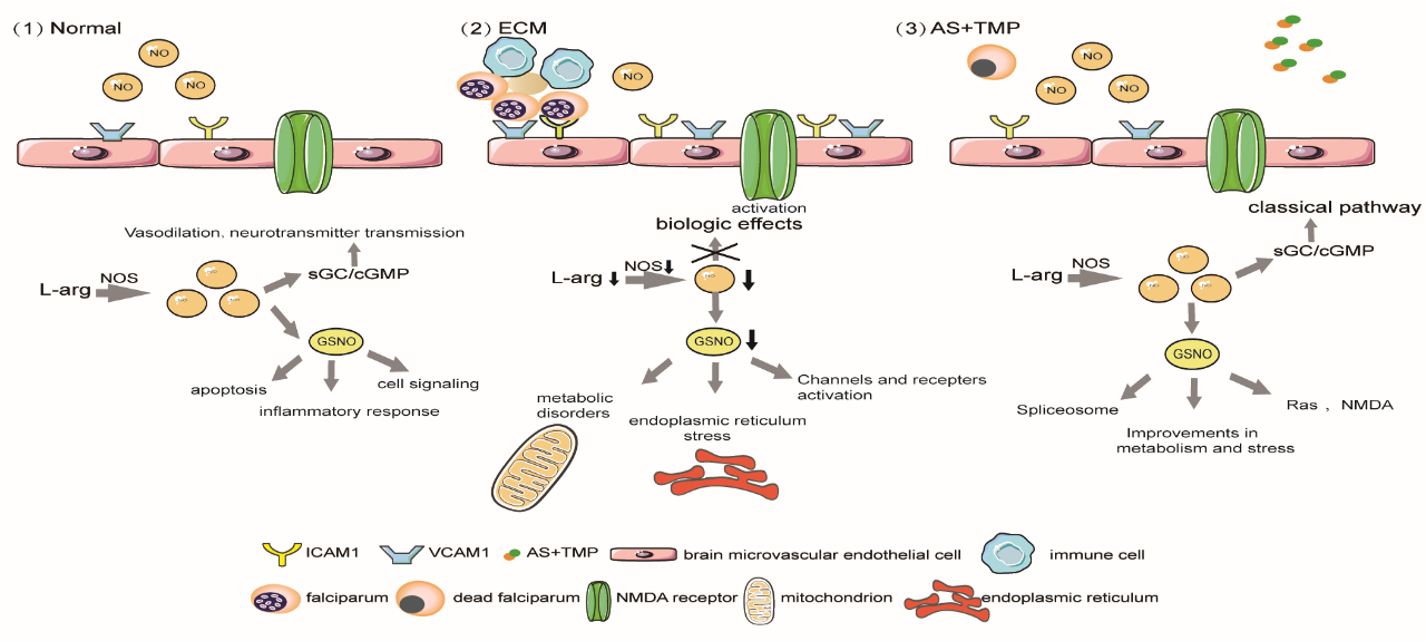 青蒿素研究中心药理室聚焦脑型疟的辅助治疗这项科学问题前期研究发现青蒿琥酯AS与川芎嗪TMP联用对实验性脑型疟ECM症状具有较好的治疗作用而其中一氧化碳NO调节起重要作用。因此在前期工作基础上研究团队对青蒿琥酯复方治疗脑型疟分子机制进行了更深入的研究验证了AS+TMP对脑血流CBF的影响检测了NO相关指标并在前期蛋白质组学研究的基础上重点研究了NO通过s 亚硝基化蛋白质的作用探讨了AS+TMP的作用机制。研究发现AS+TMP可降低血管粘连增加CBF调节NO合酶NOS活性从而调节s亚硝基硫醇s-nitrosothiols水平如代谢相关酶、NMDA受体、NOS活性从而改善症状。这些结果表明AS+TMP或可成为一种有效的治疗脑型疟的方法。