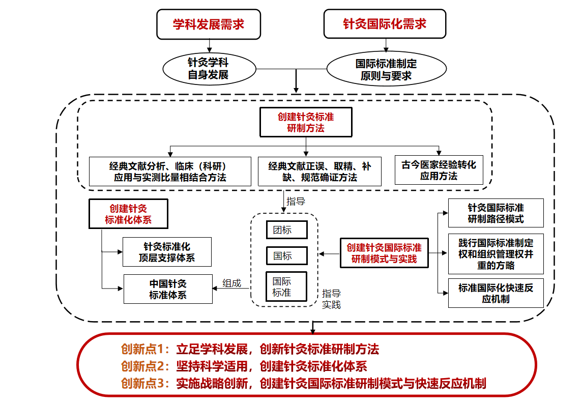 创建针灸标准化体系,是一项从无到有、从有到不断完善的系统工程,是传统针灸走向世界过程中,面对国内外需求必然产生而又必须解决的一个使命任务。本项目历时近20载,以多项国家级项目、基金为依托,围绕针灸标准化体系进行深入研究,主要科技创新包括:(1)立足学科发展,创新针灸标准研制方法:按照内在联系与业务要求,对针灸标准进行科学分类。重视针灸基础标准,优先制定针灸标准之标准,基于针灸特点与标准化原理,实现了指导各类针灸标准研制方法学创新。(2)坚持科学适用,创建针灸标准化体系:通过顶层设计制定针灸标准化规划,创设了系统化的针灸标准化规制,创建了国内国际统一协调、高效联动的针灸标准化管理体制和运行机制;解决了针灸标准体系从无到有的问题,建成了内容与形式协调统一,规范性、完整性、系统性、适用性较高的针灸标准体系。(3)实施战略创新,创建针灸国际标准研制模式与快速反应机制:采取国际标准制定权和组织管理权并重的方略,主导针灸标准国际化。在项目组创建的针灸标准化体系引领下,通过牵头制定或推动组织制修订100项不同层级的针灸标准,使针灸在临床实践、技术评估、教育培训、科研工作、产品生产等方面皆有了标准可依,在促进针灸现代化发展与主导国际针灸话语权方面发挥重要作用。