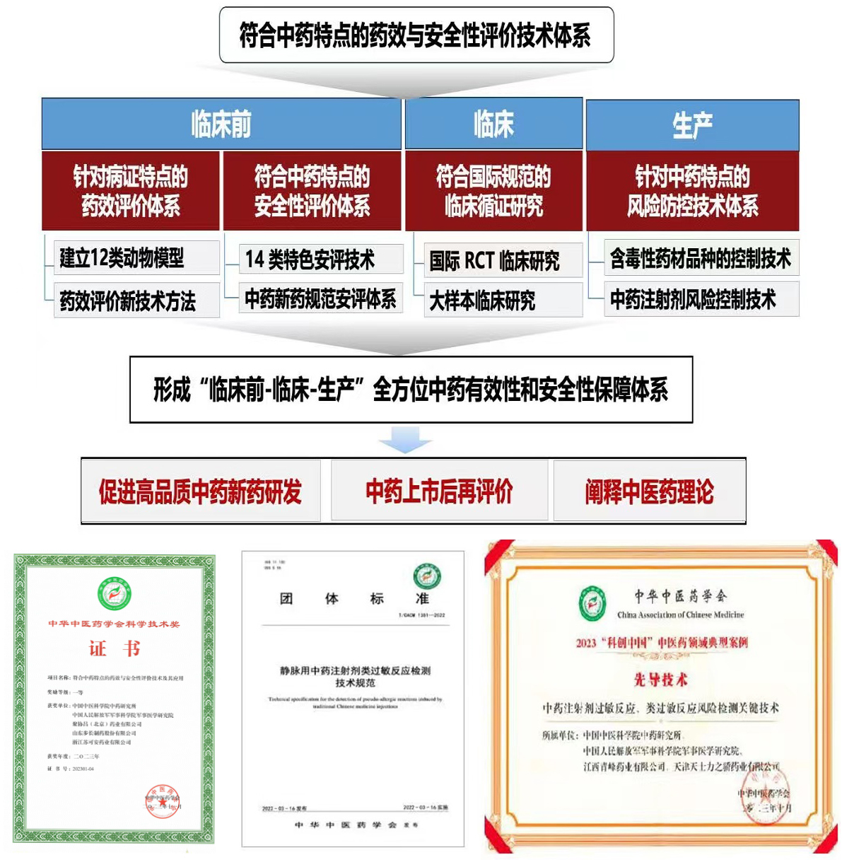 建立体现中医药特点的临床前药效和安全性评价体系、寻找高级别的中药疗效临床循证医学证据、创建特色的中药产品风险控制技术,是中医药领域长期以来急需解决的关键问题。本项目在国家重大科技专项等项目支持下,针对以上问题经过近二十年的研究,取得以下创新成果:形成了符合中医药特点的药效学和安全性评价技术体系;首次在国际上完成了金花清感颗粒治疗新冠肺炎的随机、双盲、安慰剂对照临床研究,证明其具有显著的临床疗效;针对中药产品风险,建立了适用于中药生产过程的特色风险控制技术;提出并实证了“马兜铃酸(AAs)种类不同、毒性各异,含AAs中药的毒性不能一概而论,防控AA-I/II是关键”等学术观点,促进了中药毒性理论的传承创新与发展。项目获药品注册证书6件,其中包括香港注册1个、专利授权20件;牵头和参与制定技术标准2项;主(副)编、参编著作10余部,发表论文150余篇,SCI收录50余篇。本项目产品金花清感颗粒通过我国外交部200余个使领馆支援海外抗疫,为国内外抗击疫情做出了重要贡献。项目组6个特色产品使数千万患者获益,经三年获得经济效益42余亿元,为新冠肺炎、心脑血管疾病等相关中药的临床用药以及中药科学监管提供了支撑。