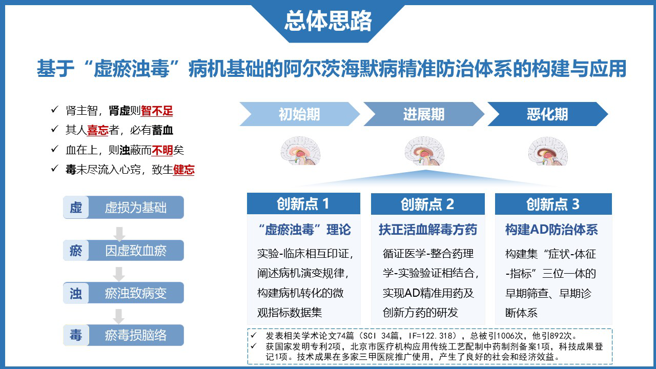 阿尔茨海默病(AD)患病率逐年攀升且有年轻化倾向,西医治疗仅能改善症状不能阻止或延缓疾病进展。中医药治疗AD历史悠久,潜力巨大。目前,AD临床证型复杂,亟需简化和规范现有证候类型,创新病机治法以提升临床疗效。此外,如何实现高危人群的早期筛查也是摆在我们面前的一道难题。针对以上瓶颈问题,本团队在多项国家级和省部级项目资助下,经过10余年的攻关研究,建立了基于“虚瘀浊毒”病机基础的AD精准防治体系。主要科技创新及内容如下:(1)针对AD不同病程阶段的病理因素,创新性提出具有共性病机特点的“虚瘀浊毒”理论,采用多种实验模型阐述其病机演变的科学内涵,构建了病机演变的微观指标数据集,促进临床精准辨证。(2)采用“循证医学-整合药理学-实验模型”相结合的研究方法证实扶正活血解毒方药的疗效优势及作用靶点,实现AD精准用药及创新中药复方的研发。(3)综合多个生物信息数据库,筛选与AD发病相关的危险因素,结合中医“治未病”理念,构建了具有中医特色的早期筛查、早期诊断体系。该体系已在全国15家医疗机构和社区医院推广使用,实现了AD的精准防控,产生重大的经济和社会效益。共发表学术论文74篇(SCI 36篇),获中国中医科学院医疗机构应用传统工艺配制中药制剂备案1项、国家发明专利2项、科技成果备案1项。获得科技部重大新药、国家自然科学基金、北京市科技计划专项等多项课题资助。