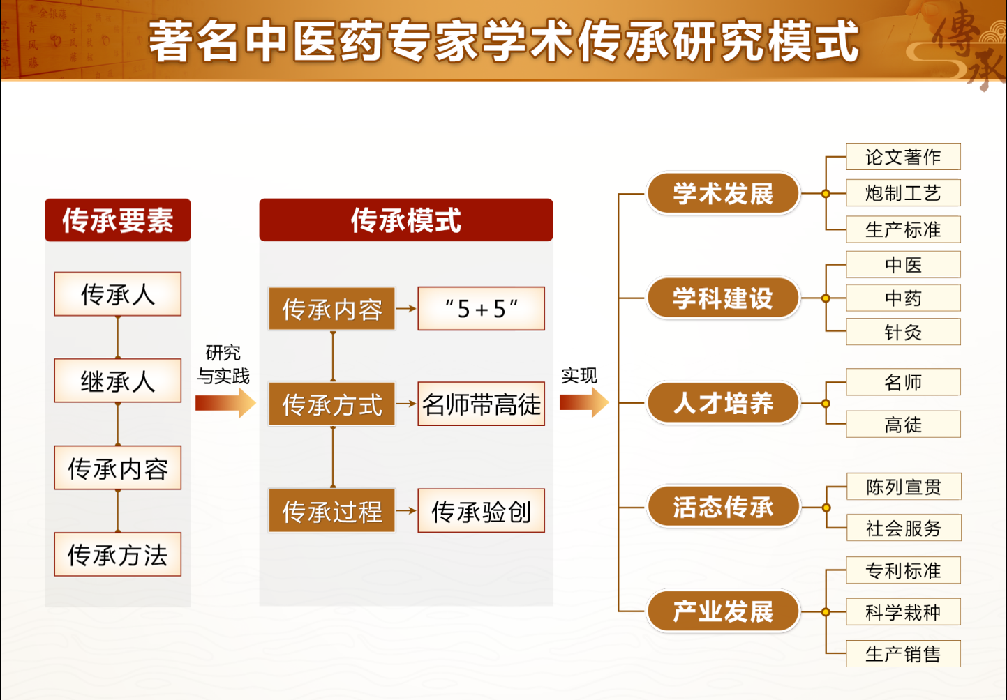 自2007年首开著名中医药专家传承博士后研究工作以来,项目组围绕中医传承的“谁传授,谁继承, 传什么,怎么传?”的核心问题,在科技部、中医局、文旅部、中国科协等7个部门18项课题资助下,历时15年从传承角度凝练著名中医药专家学术思想和实践经验,形成以“5+5”学术传承内容 、“名师带高徒”传承方式、“传授-继承-验证-创新”传承过程为一体的可复制、可推广的中医药专家传承研究模式,运用于中医、中药、针灸学科代表性专家王永炎、陆广莘、程莘农、王孝涛学术传承研究,全面继承、实践验证、创新转化应用,形成多形式研究成果,实现了学术发展、学科建设、人才培养和产业融合。发表论文116篇, 出版著作44部,授权专利24项,建立标准规范41项,传承服务基地11个,药材种植基地123个, 获科技成果奖7项,产生了较好的经济和社会效益。