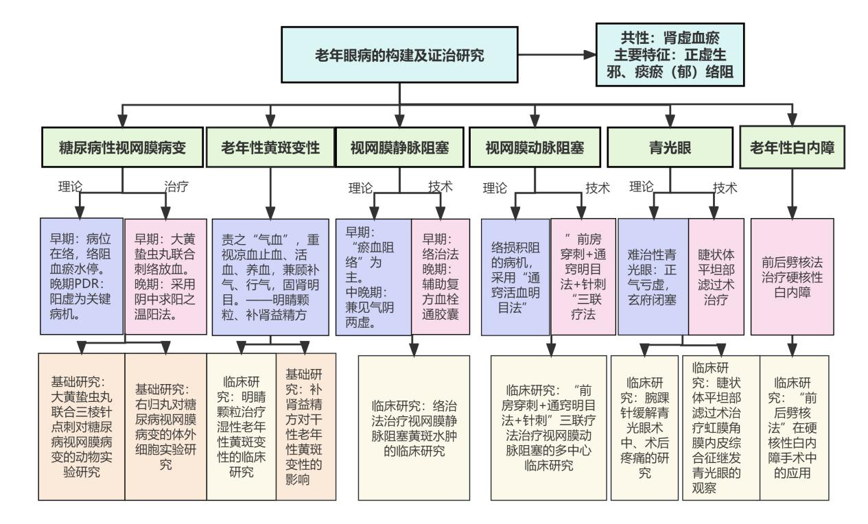 《中国眼健康白皮书》发布致盲的主要原因已由感染性和营养不良性眼病变为年龄相关性眼病(亦称老年性眼病)。本课题组构建中医眼科老年眼病学框架,依托全国中医药老年眼病防治中心进行临床及实验研究。先后获得多项国家级及省部级课题的支撑,主要内容及创新点如下:(1)提出络阻血瘀水停为早期糖尿病性视网膜病变的主要病机,采用大黄蛰虫丸联合三棱针点刺治之。创新性提出阳虚为增殖性糖尿病性视网膜病变的关键病机,采用“阴中求阳”之温阳法。(2)将老年性黄斑变性责之“气血”,在治疗上重视凉血止血、活血、养血,兼顾补气、行气,固肾明目。(3)针对视网膜动脉阻塞瘀塞而致窍道不通、脉道不利的病机,形成“前房穿刺+通窍明目法+针刺”三联疗法的临床方案。(4)首次提出视网膜静脉阻塞“络损积阻”的发病机制,采用刺络联合祛积通络法治疗。(5)将难治性青光眼病因病机归纳为“正气亏虚,玄府闭塞”。唐由之国医大师首先提出睫状体平坦部作为内眼手术的切口部位,比国外早了16年。创新睫状体平坦部滤过术,用于治疗难治性青光眼。(6)创立“前后劈核法”治疗硬核性白内障,明显提升手术效率。本项目组牵头制定国际中医眼科临床指南8部,公开发表老年眼病相关论文157篇,获得专利4项,软著1项,治疗方案及药物在全国多家医院推广应用,创造了良好的社会效益和经济效益,开创老年眼病的新时代。