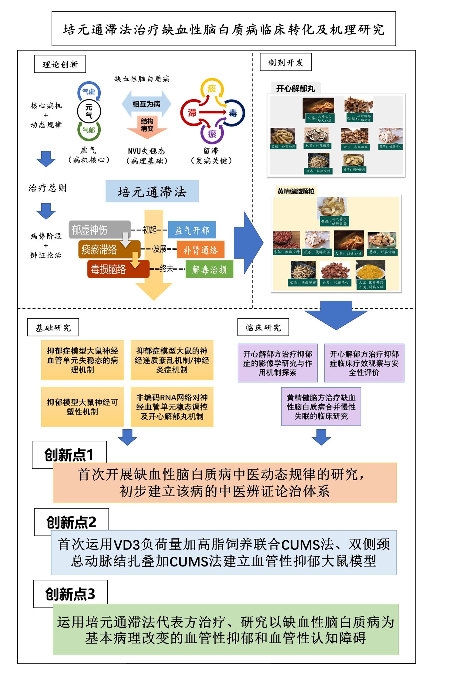 缺血性脑白质病是老年人的常见病和难治性疾病,主要病理变化为脑微血管缺血,破坏神经血管单元结构,诱发情感和认知功能障碍。本团队依托国家自然科学基金、北京市科委十病十药研发专项等项目资助,传承了王永炎院士治疗缺血性脑白质病经验,创立了缺血性脑白质病的辨证论治体系并划分了病势阶段,提出该病发生发展的动态规律,明确了该病“元气亏虚、气血郁滞”的核心病机,凝练出“培元通滞”治疗原则,创制了两种疗效显著的医疗机构制剂(开心解郁丸和黄精健脑颗粒)。本项目通过临床观察、实用性随机对照试验等前瞻性研究,验证了上述药品的疗效与安全性,并运用功能磁共振技术,发现开心解郁方对该病脑功能连接性的特异性作用。在此基础上,本团队通过复制血管性抑郁大鼠模型和血管性认知障碍大鼠模型,结合基因芯片技术、生物信息学技术等新技术完成疗效机制创新研究。从单胺递质、神经再生、血脑屏障和神经血管单元稳态等多角度阐述处方治疗缺血性脑白质病的作用机制。此外,本团队临床运用上述处方15年以上,并在10余次学术会议发言推广,应用累计超3万人次,获得发明专利授权2项,培养研究生14人,发表论文107篇,出版相关专著7部,创造了一定的社会与经济效益。