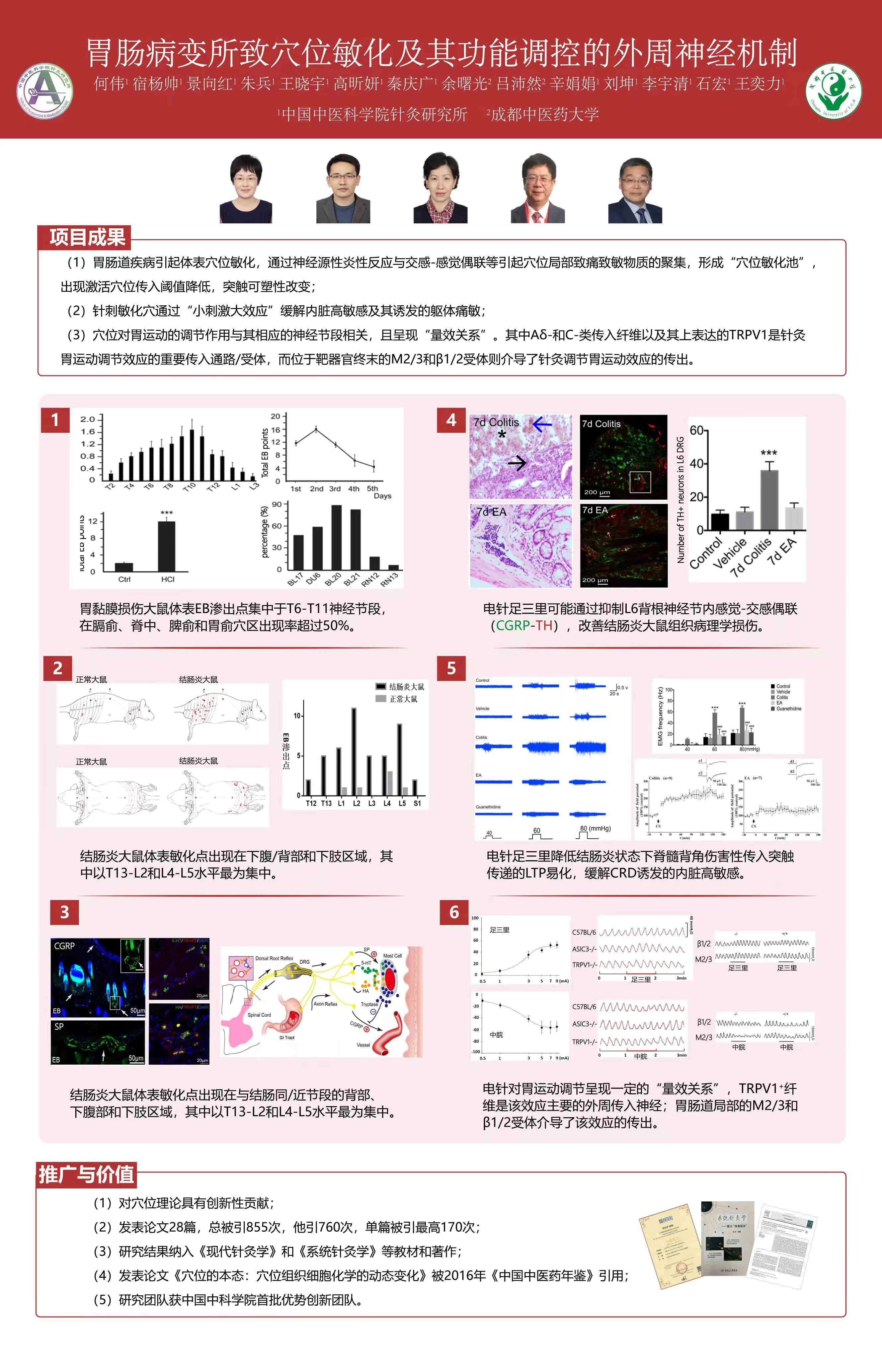 创新点:首次提出穴位动态理论,并以胃肠疾病为载体揭示了疾病状态下穴位动态敏化过程及其功能调控的外周神经机制,科学解释临床“揣穴”的意义和旁开对照微小针刺的有效性,回答了国外对穴位是否存在、穴位大小和功能相对特异性的质疑。
