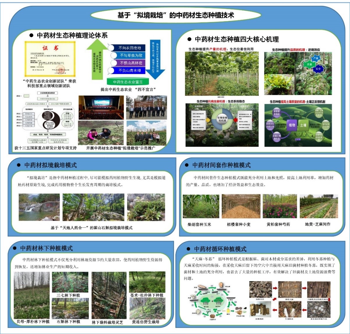 团队首次提出基于“天地人药合一”和“逆境效应”的中药材“拟境栽培”生态种植理论,突破了传统中药材生产种植模式。重点提出了药用植物适应环境胁迫的策略及道地药材“拟境栽培”的技术内容、难点和关键点。2018年,郭兰萍研究员提出了“不向农田抢地,不与草虫为敌,不惧山高林密,不负山青水绿”的中药生态农业宣言,引领全国中药材生态种植有序开展。同年,团队荣获国家科技部重点领域“中药生态农业创新团队”。
