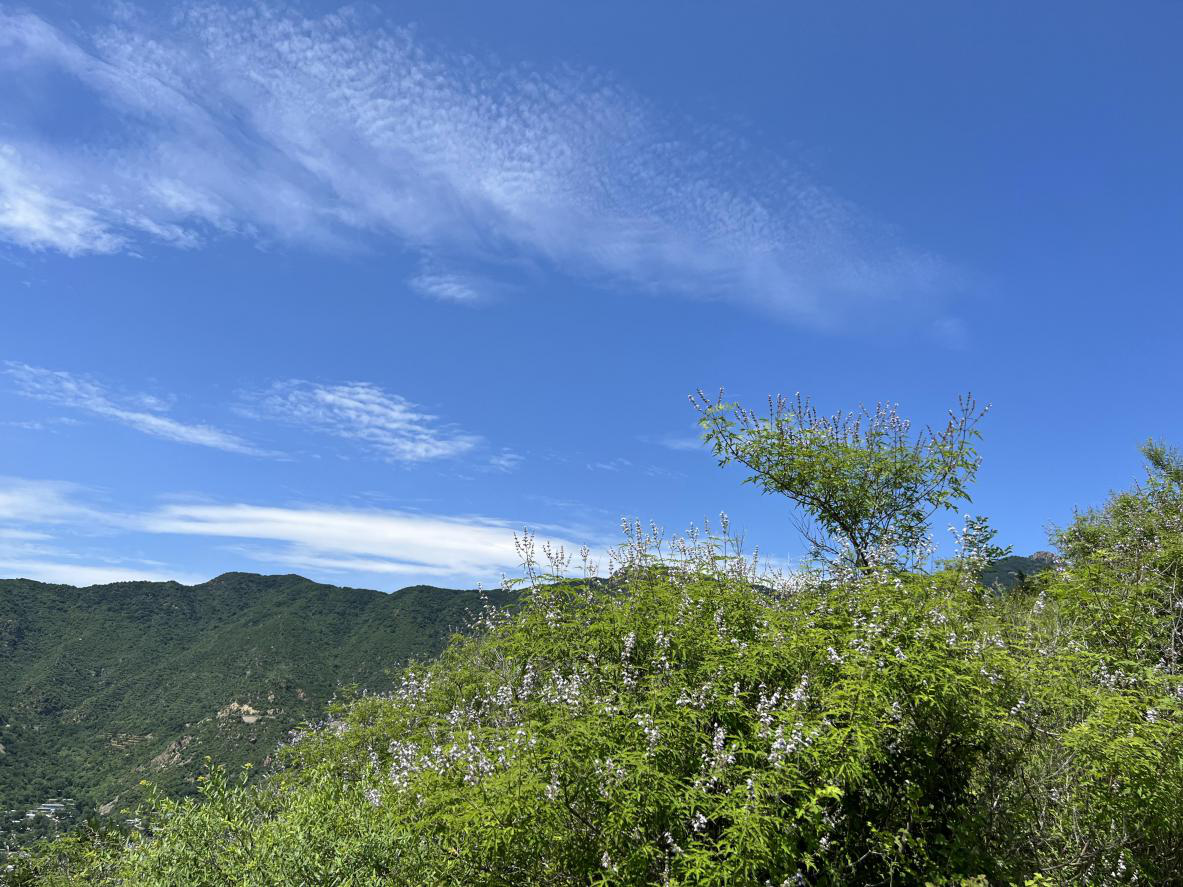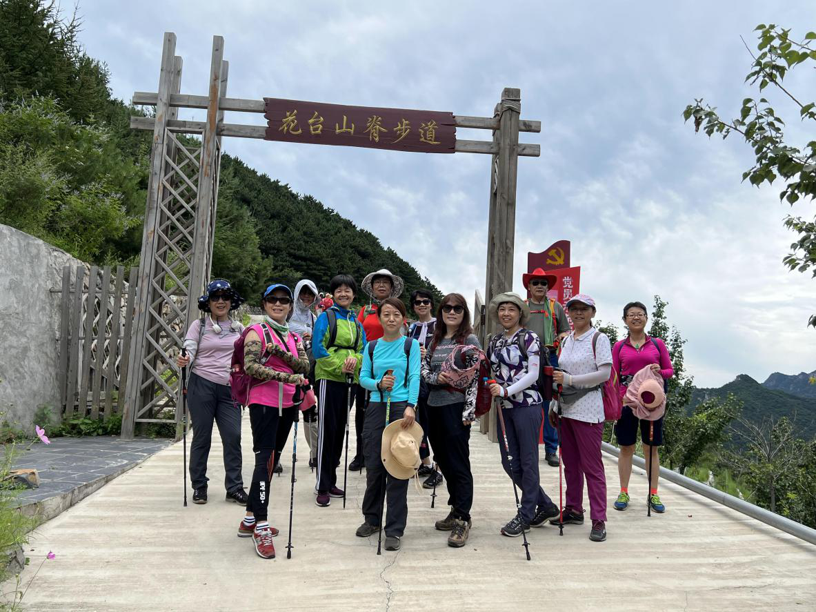 7月7号接院工会通知,可以组织活动了,赶紧和海坨领队商量,怕入伏后天气更加闷热,将第一次活动安排在今天,正好是初伏第一天,也是取夏练三伏之意。当时看天气预报今天是小雨,想着这条线路阴天走着很舒服,便选择了此线路。早上到时也确实是多云天气,下车前还下了几滴雨,下车后感觉很是凉爽,先沿着公路走,走到沙子坨路口公交站下公路到东村村,找到路边阴凉处午餐,虽然这时的天时而晴时而多云,但阴凉处还是挺凉快的,让我们误以为今天的徒步没有难度。水足饭饱之后继续前进,从村中穿过,开始走花台山脊步道,这个名字起的非常准确,4公里的步道大部分在山脊,而且步道的爬升还是很明显的,最为关键的是此时的天气晴空万里,所有人都一览无余地暴露在阳光之下,正是午后温度最高时,可想而知此时的爬升还是有些困难的。望着远处的亭子,以为那是山脊的最高处,走走停停,终于到达亭子时,发现后面有个更高的陡坡在等着我们,感觉气力一下子全失掉了。先到亭子的同事让出座位继续前行,我们便坐下来休息,坐了很久,陆续有人到来时我们也让出座位继续出发。虽然艰难,最终还是到达了最高点,之后的下山路便容易了很多。