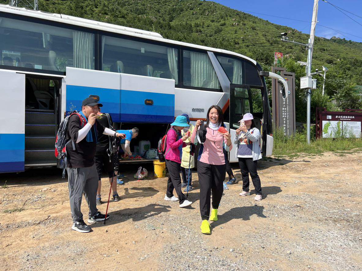 感谢领队背靠海坨山、司机师傅和收队!怕大家中暑,海坨领队在徒步终点准备了西瓜,走完全程后吃口西瓜幸福感倍增,感谢海坨领队!感谢收队潘老师的耐心陪伴,一直陪伴着后队队员走完全程!感谢今天参与活动的会员,天气炎热,大家都安全完成了今天的徒步任务。