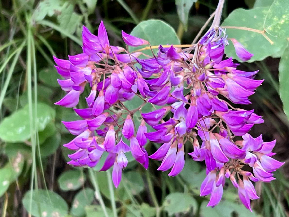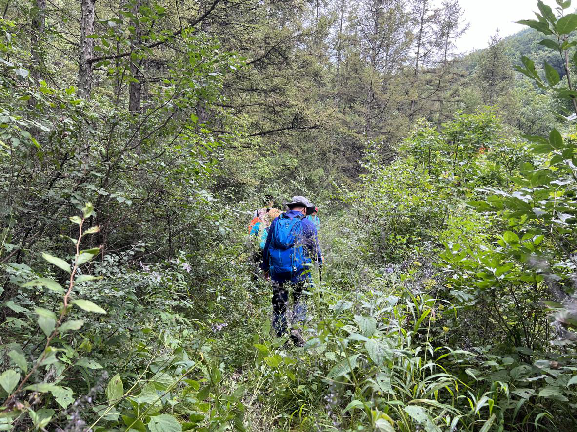 今天的天气不错,多云,预报中的小雨并未到来,使得我们如愿走了山野穿越的线路。这条线路非常的原始,一人宽的小路在山中蜿蜒,脚下经常是松软的落叶,由于落叶下的路并不平整,走起来深一脚浅一脚,使得一群滴酒未沾的人竟然走出了醉酒后的感觉。整条小路淹没在绿色之中,一群人在天然氧吧中行走,路边各种野花盛开,心情甚是愉悦。整条小路难度并不很大,只有在下山路上有一块大石头堵住了去路,只能从石边慢慢下移,由于此处坡度陡,且脚下泥土松软,造成了不小的难度,感谢广安门医院何龙老师,伸出了有力的援手,护送每一个人平安通过!