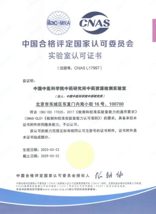近日,中国中医科学院中药研究所(中药资源中心)中药资源检测实验室成功通过了中国合格评定国家认可委员会(下称CNAS)的审核,并获得实验室认可证书(注册号:CNAS L17997),认可范围内“中药”和“药用植物种子”项目可以使用CNAS国家实验室认可标志和ILAC国际互认联合标志,表明中药资源中心相关实验室已建立了符合国际标准的质量管理体系,具备了按相应认可准则开展检测和校准服务的技术能力。实验室可承担中药材和饮片、提取物、配方颗粒、中药材种子种苗的物种鉴定,以及药用植物种子水分、净度、重量、发芽试验等相关项目检验。
