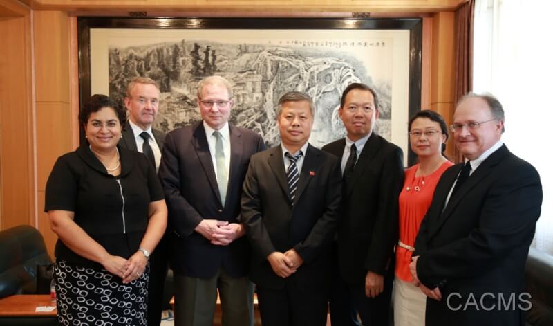 应德国汉诺威医科大学邀请,2016年7月11日,张伯礼院长率团访问德国。 7月11日,代表团访问德国汉诺威医科大学。张伯礼院长与校长Christopher Baum,以及国际合作部主任Hermann Haller、康复医学中心主任Christoph Gutenbrunner等分别进行了会谈,参观了康复科特色诊疗室、妇科病房及研究室。其中针灸治疗已经在其康复科得到了广泛应用,取得了良好的疗效与认可。 当天下午,中德专家进行了疼痛、妇科、肾病微循环、耳穴刺激治疗高血压等方面的学术报告。同日,张伯礼院长接受了新华社驻柏林记者采访,向记者回答了有关我院屠呦呦教授获诺奖后新形势下的未来发展规划及中医药人才培养等问题。 此前我院与汉诺威医科大学已签署合作备忘录,双方拟通过学术会议、合作研究开展如心脏病、高血压、妇科病及疼痛等优势病种的学术交流、医疗人员教育培训等。 (国际合作处 文, 新华社、国际合作处 图) 张伯礼院长会见汉诺威医科大学校长克里斯托弗·鲍姆 张伯礼院长接受新华社驻德国记者采访